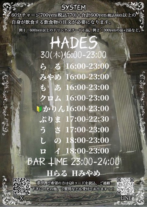 栄・大須・金山 HADES【キャストさん募集中】Concept Cafe HADES【公式】@CafeBar_HADES·10月31日冥界開きました! ご来店お待ちしてます!! 修正 もあ→休み引用【キャストさん募集中】Concept Cafe HADES【公式】@CafeBar_HADES·10月30日本日も冥界堕ちありがとうございました!明日の冥界です。キャストいっぱいでお待ちしてます!! #ハーデス #冥界 #大須 #コンカフェ1,508