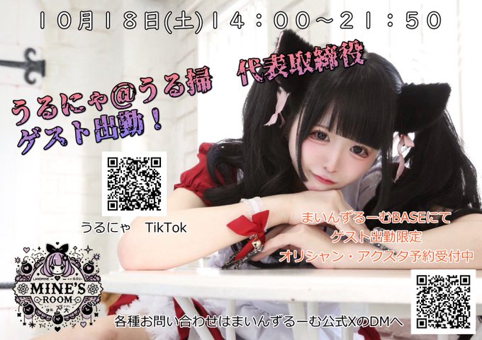 まいんずるーむ【公式】地雷系コンカフェ🍾キャスト募集中@mines_room·10月5日こちらのオリシャン、アクスタの締切は今日までです🙇🏻♀️引用まいんずるーむ【公式】地雷系コンカフェ🍾キャスト募集中@mines_room·9月26日お知らせ📣 10月18日(土) TikTokerのうるにゃ@うる掃 代表取締役さんゲスト出勤です🎉 当店BASEにて限定オリシャン、アクスタのご注文も受付中です✨ 当日のご来店お待ちしてます😊 うるにゃさんTikTok http://tiktok.com/@urunya0317?_t… まいんずるーむBASE http://minesroom.base.shop4743