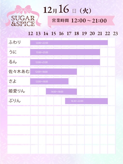 栄・大須・金山 SUGAR&SPICESUGAR & SPICE 大須コンカフェ シュガスパ@sugar_spice_osu·. .°ʚ SUGAR&SPICE ɞ°. 🎀12.16 お給仕表🎀 ご主人様、お嬢様のご帰宅お待ちしております🤍 #SaSお給仕表1:464299