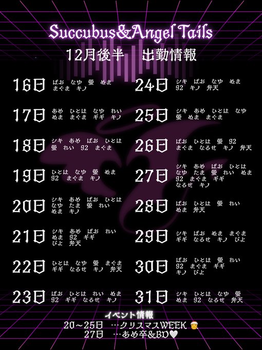 栄・大須・金山 サキュバスシーシャTAILS 名古屋駅固定サキュバス シーシャBAR TAILS名古屋店💜@Succubus_Tails·😈12月後半降臨情報😈 🕐営業時間🕐 平日17:00~23:30 土日祝15:00~23:30 🎪イベント🎪 20~25日 クリスマスWEEK🎅 27日 あめ卒業&BDEV🤍 変更などはキャスト各自のアカウントをご確認くださいませ。 皆様のご堕落をお待ちしております💖27993