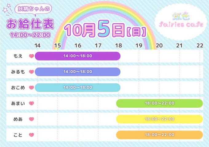 虹色fairies cafe🌈キャスト募集中🧚🏻♀️@nijicafe_osu03·昨日も沢山のご入国の旅人様ありがとうございました✨ 本日10/5(日)は14:00開国です🌈 妖精ちゃん⤵️🧚🏻♀️ もえ@moepi_nijicafe みるも@milumo_nijicafe おこめ@okome_nijicafe あまい@amai_nijicafe めあ@mair_nijicafe こと@koto_nijicafe 旅人の皆さまお待ちしてます✨ #コンカフェ #大須さらに表示57573