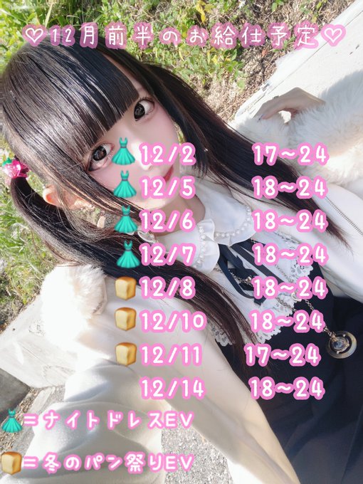 固定あめの@PARFUN@ameno_parfun·♡12月前半のおきゅ予定♡ あげてると思っていた、、遅くなりました🥲12月はたくさんのイベント盛りだくさんでキャンペーンもあるので会えたらうれしい( / ̫ т )♥ 12/1~12/7 ナイトドレスEV 12/8~12/12冬のパン祭り 12/13きらり生誕祭 たくさんがんばるので会えたらうれしい😭 #コンカフェ営業14178