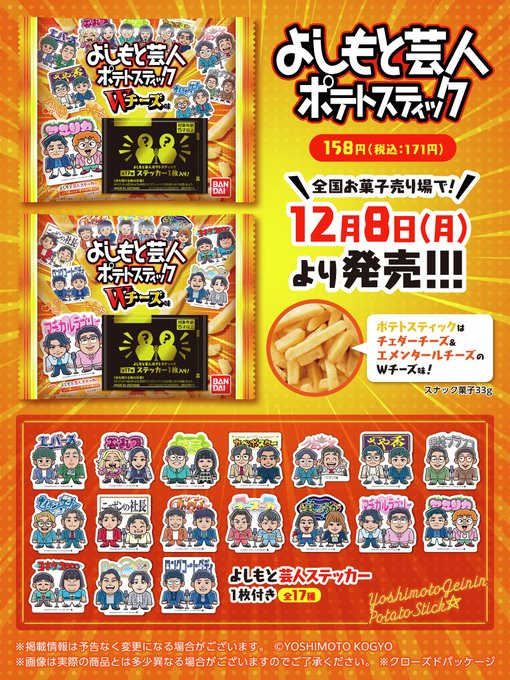 栄・大須・金山 カルティアなな🤍xaptia@nana_xaptia·2時間これわたし一切見かけないのですが??引用正方形のプロフィール画像バンダイ キャンディ【公式】@candytoy_c·12月1日📢よしもと芸人ポテトスティック 12月8日(月)発売🎉‼🌟  ̄V ̄ ̄ ̄ ̄ ̄ ̄ ̄ ̄ ̄ ̄ ̄ ̄ Wチーズ味🧀のポテトスティックに オリジナルステッカー1枚付き✨ ぜひ全国のお菓子売り場でお買い求めください‼ 詳細はこちら☞https://bandai.co.jp/candy/products/2025/4570117928499000.html… #よしもとポテトさらに表示1103
