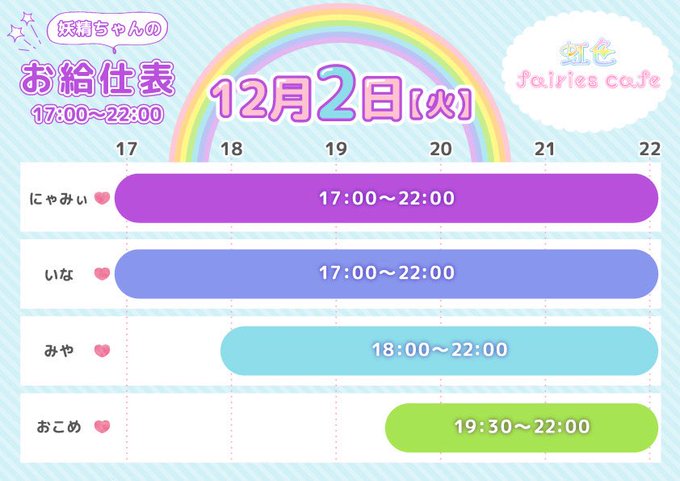 栄・大須・金山 虹色fairies cafe虹色fairies cafe🌈キャスト募集中🧚🏻♀️@nijicafe_osu03·本日はみはねぷち生誕卒業でした💐 お越しいただいた旅人の皆様ありがとうございました✨ 明日は虹の国臨時休国です💤 次回12/2(火)17:00開国です! 妖精ちゃん🧚🏻♀️⬇️ にゃみぃ@nyami_nijicafe いな@ina_nijicafe みや@miya_nijicafe おこめ@okome_nijicafe 旅人のみなさまお待ちしてます🌈さらに表示242
