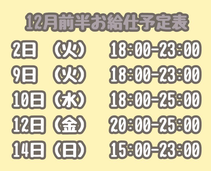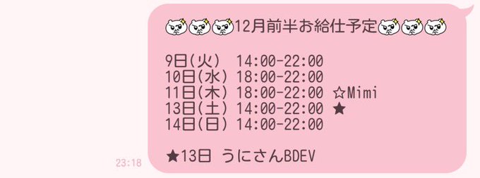 栄・大須・金山 ウィッチズアークWitches Ark(ウィッチズアーク)名古屋店さんがリポストまいか@WitchesArk@maikatenshisan·♡ 12月前半 ♡ 12.3(Wed) 17-22 12.5(Fri) 18-L 12.6(Sat) 17-L 12.7(Sun) 13-21 12.9(Tue) 17-22 12.10(Wed) 17-22 12.12(Fri) 17-23 12.13(Sat) 15-L 💎サフィBD 12.14(Sun) 15-L 💎119140