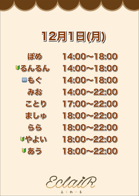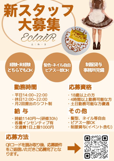 栄・大須・金山 EclaiR(えくれーる)【キャストさん募集中❣️】EclaiR🍩(えくれーるかふぇ)@EclaiR_Cafe·本日もえくれーる🍩へ御来店いただきありがとうございます! 明日は14時オープンです❣️ 初出勤の新人さん14-18でいます✨✨ ♡皆様の御来店お待ちしております♡ -----------------------------------‐ キャストさん大募集中❕ 求人募集はコチラ⬇️ 公式LINEアカウント⇒[http://lin.ee/S4c12iq]さらに表示1249