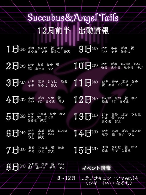 栄・大須・金山 サキュバスシーシャTAILS 名古屋駅固定サキュバス シーシャBAR TAILS名古屋店💜@Succubus_Tails·😈12月前半降臨情報😈 🕐営業時間🕐 平日17:00~23:30 土日祝15:00~23:30 🎪イベント🎪 8~12日 ラブサキュシーシャver.14 メンバー:シキ・れい・なるせ 変更などはキャスト各自のアカウントをご確認くださいませ。 皆様のご堕落をお待ちしております💖1341