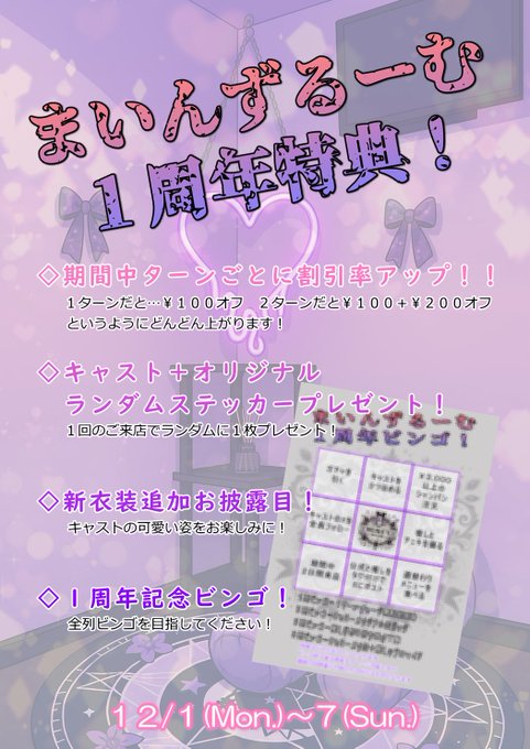 栄・大須・金山 まいんずるーむまいんずるーむ【公式】地雷系コンカフェ🍾キャスト募集中@mines_room·2時間オープンしました🎀 本日もよろしくお願いします🌷 修正 ここ→休み ちゅん→休み引用まいんずるーむ【公式】地雷系コンカフェ🍾キャスト募集中@mines_room·18時間本日もまいんずるーむにご来店頂きありがとうございました💜 明日のまいんずるーむです🎀14233