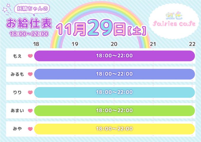 栄・大須・金山 虹色fairies cafe虹色fairies cafe🌈キャスト募集中🧚🏻♀️@nijicafe_osu03·7時間もえちゃん18:30頃の入国です🙏引用虹色fairies cafe🌈キャスト募集中🧚🏻♀️@nijicafe_osu03·11月28日本日もご入国いただきありがとうございました! 明日11/29(土)は18:00開国🌈 お間違いのないようお願いいたします! 妖精ちゃん⤵️🧚🏻♀️ もえ@moepi_nijicafe みるも@milumo_nijicafe りり@riri_nijicafe あまい@amai_nijicafe みや@miya_nijicafe 旅人の皆さまお待ちしてます✨ #コンカフェさらに表示22453