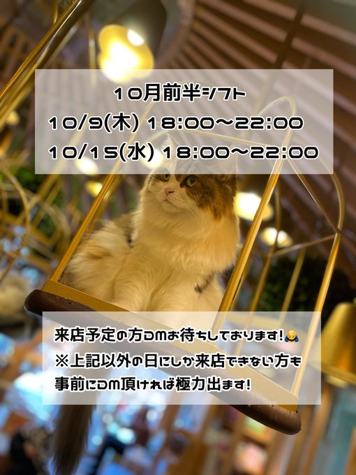 固定園祇🧬@ビジュラム名古屋@bjlmngy_sonogi·[10月前半] 6日(月) 18:00-23:00 13日(月) 18:00-23:00 10/4-6 天使の日 月曜しかいないし少ないけど会いに来て欲しいです𖦹6288