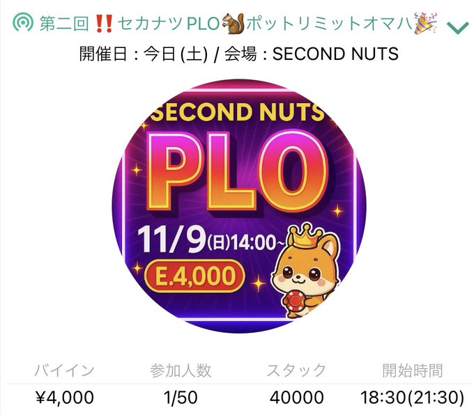 SECOND NUTS♧セカンドナッツ♤ポーカー♡名古屋 栄さんがリポストりり@セカナツ@Lily_SecondNuts·7時間PLOタイマースタートしてます‼️🐿引用SECOND NUTS♧セカンドナッツ♤ポーカー♡名古屋 栄@SecondNutsPoker·7時間18:30〜のsecondnut🐿✨ 【セカナツPLO🐿️ポットリミットオマハ🎉】 ●4枚のハンドが配られ、その中から必ず2枚のカード使います。 ●ポットリミットとは?ベットの上限がポットの大きさに制限されます。 🕖 スタート 18:30 🕤 クローズ 21:30 (受付終了) 💰 参加費 エントリー:¥4,000 /さらに表示22693