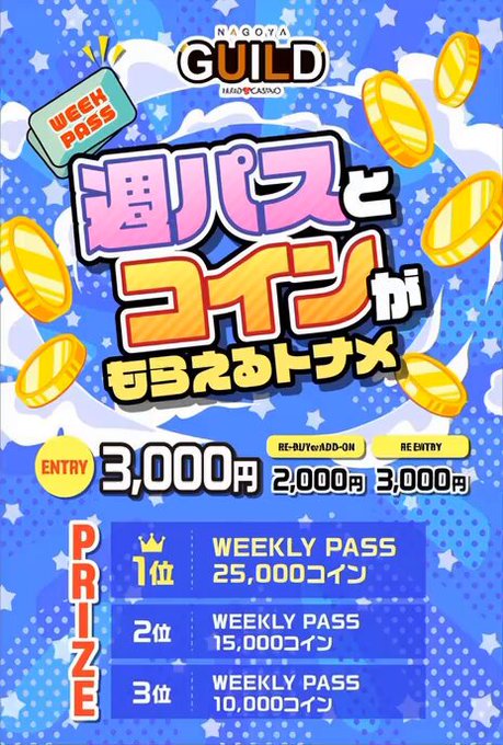 栄・大須・金山 ナゴヤギルドナゴヤギルド 名古屋 ポーカー@AGNagoyaguild·本日19:00からは 🎫週パスとコインがもらえるトナメ🎫 毎週水曜日は WEEKLYPASSとコインが 上位3名までもらえます🤩❗️ 週パスとコインをGETしてお得に遊びましょう🌟 🍭詳細🍭 レイトレジスト 20:40 参加費 3,000円 リバイor アドオン 2,000円 #ポーカー #トーナメント #名古屋 #名駅0:06244