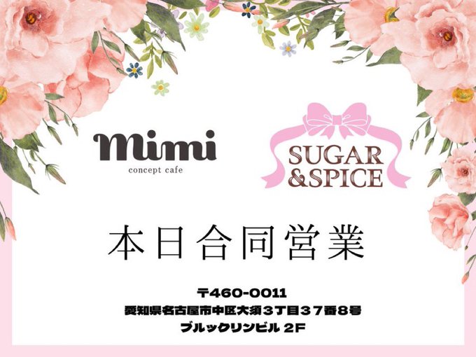 栄・大須・金山 SUGAR&SPICEりみ🪽Mimi ♡12/21生誕♡@sas_rimi_·23時間合同だってー!!キャストいっぱいだ^_^引用SUGAR & SPICE 大須コンカフェ シュガスパ@sugar_spice_osu·23時間. .°ʚ SUGAR&SPICE ɞ°. 🎀11.19 お給仕表🎀 SUGAR&SPICEは店休日です💤 MimiにてSUGAR&SPICEと合同営業になります🤍 #SaSお給仕表272,193