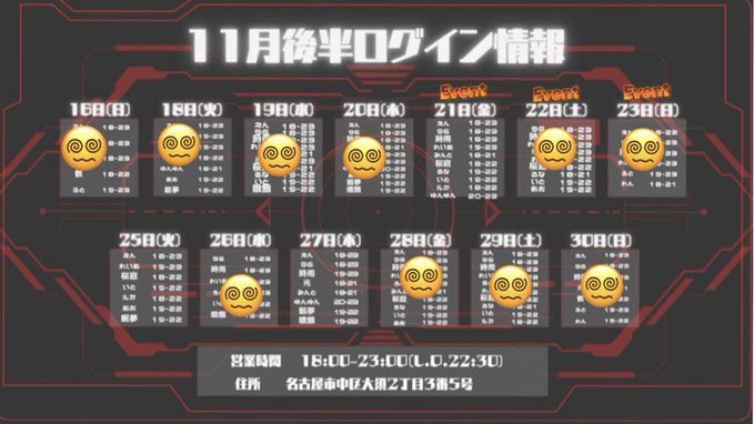 固定ろと@名古屋メンコン@C_Male_loto·11月後半の予定だよおお😵💫 19:00〜らすとまで!3142