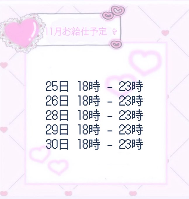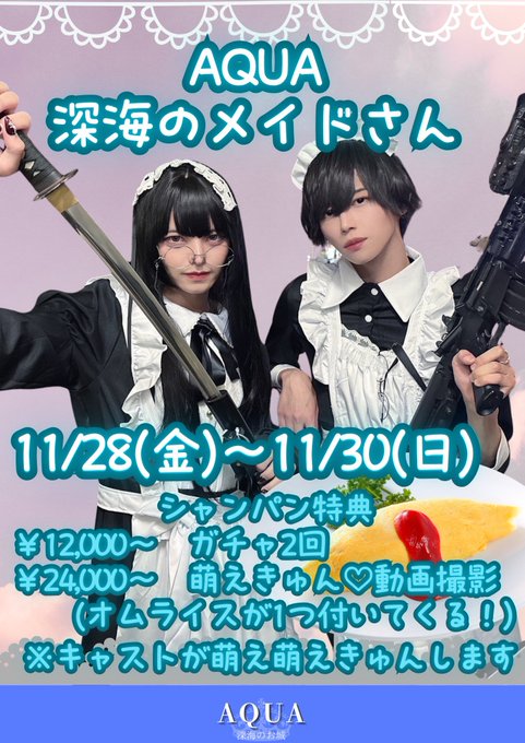 栄・大須・金山 AQUA固定詩羽 (AQUA)@AQUA_C_otoha·11月後半おきゅいん表‼️ 29日と30日はメイドさんなるよ〜‼️ 萌え萌えになる魔法かける練習しといた方がいいかな……🤔 #メンコン #自撮り界隈 #いいねでDM #メンコン営業 #深海のお城AQUA0:134505