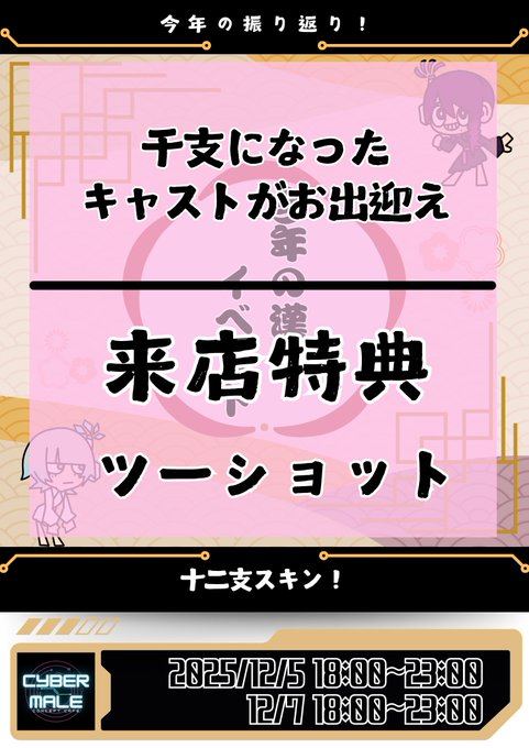 🌐Cyber_Male🔊名古屋大須メンズコンカフェ@Cyber_Male_·【🖌今年の漢字EV☁】 期間中キャストが干支に!🐍 期間:12/5~12/7 特典:画像を参照ください。 #メンコン #大須 #コンカフェ #名古屋 #メンズコンカフェ #サイバーメールで接続完了513757