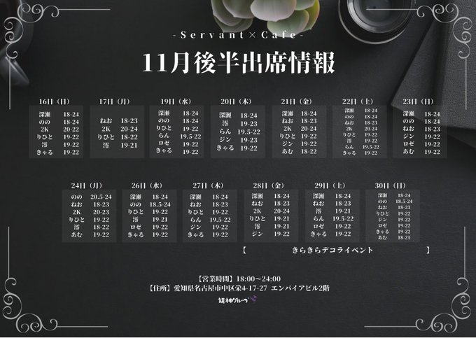 栄・大須・金山 Servant×Cafe固定Servant×Cafe🍽️名古屋メンズコンカフェ@Servant_Cafe_·𖤐☕︎11月後半出席情報☕︎𖤐 営業時間18:00~24:00(L.O.23:30) 【イベント予定】 11/28~31 きらきらデコライベント ※初回ご来店時の際、身分証明書が必要になります。 顔付き身分証→1点 顔なし身分証→1点+カード等の名前が記載されてるもの1点 計2点351,153