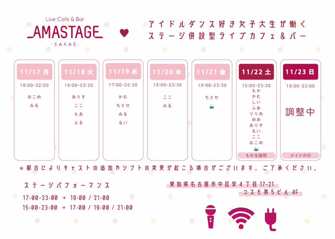 栄・大須・金山 Live Cafe&Bar AMASTAGE 栄店固定🌸LiveCafe&BarAMASTAGE栄店🌸@amastage_sakae·【🎀今週の #AMASTAGE栄店 🎀】 11月22日(土)もか生誕祭🎂 11月23日(日)メイドの日🎀 今週もご来店お待ちしております❤️452,223