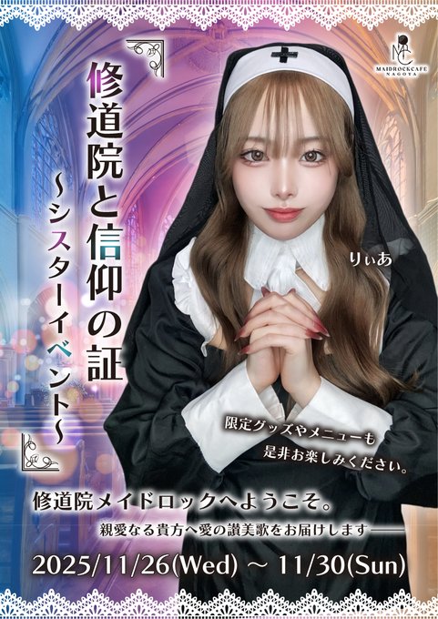 栄・大須・金山 メイドロックカフェ名古屋このシスター衣装でお給仕します🖤 会えるオーディエンス様はDMしてにゃ〜ん💌 個人的好きイベントだから楽しみたい😼引用メイドロックカフェ名古屋【公式🎸】@mrc__ngy·10月10日⚡️📡緊急発信📡⚡️ 11/26~11/30【⛪️修道院と信仰の証✝️】 修道院メイドロックへようこそ─ シスターイベント開催です✨ 限定のグッズやメニューをご用意して、 親愛なるオーディエンス様をお待ちしております☦︎︎ #MRC #MRC名古屋1271,211