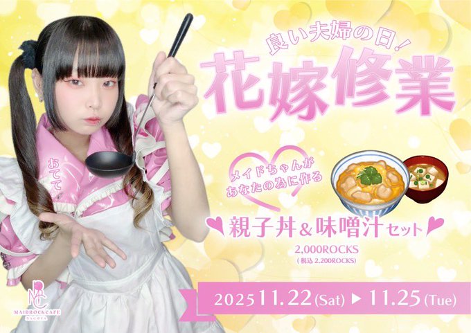 栄・大須・金山 メイドロックカフェ名古屋にゃんめたる🎸0124✦︎0125@MAIDROCKCAFE@nyanmetal_mrc·8時間にゃんの大好きな手作りごはんイベントo̴̶̷̤ ̫ o̴̶̷̤ 親子丼つくりたいです₍ᐢー̀ ̫ー́🥚💛 嫁にゃん?おかあにゃん?の親子丼食べに来てくれるオーディエンス様DMください🎀引用メイドロックカフェ名古屋【公式🎸】@mrc__ngy·11月8日⚡️📡緊急発信📡⚡️ 【11/22~11/25】 🩷🤍いい夫婦の日🤍🩷 🍽️😤花嫁修業😤🍽️ 🔥開催です🔥 メイドちゃんが 貴方のために作る親子丼 是非味わいに来てくださいね♪115856