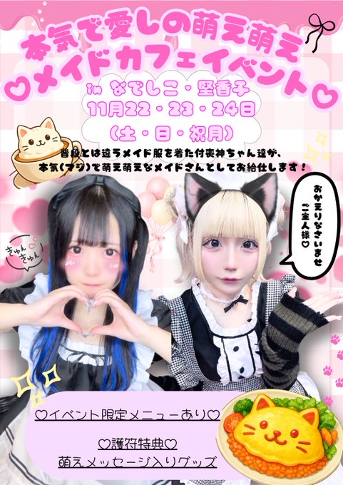 栄・大須・金山 コンセプトカフェ なでしこもちの🍡なでしこ@mochino_ndsc·11月13日メイドカフェイベント❕ 22日と23日どっちも12-17でいます💞 どっちも早めの時間しかいないけどメイドのもちのに会いにきてほしいな、|•͈ ·̫ •͈ ᐡ)引用大須 コンカフェ なでしこ キャスト大募集中‼️@nadeshico223·10月31日🎀💗本気で愛しの萌え萌え💗🎀 🌸メイドカフェイベント開催🌸 普段とは違うメイド服を着た付喪神ちゃんたちが、 本気(ガチ)で萌え萌えメイドさんとしてご奉仕します♡ 📅11月22日・23日・24日 💖イベント限定メニューもたくさん💖 💌護符特典:サイン入り○○さらに表示8269