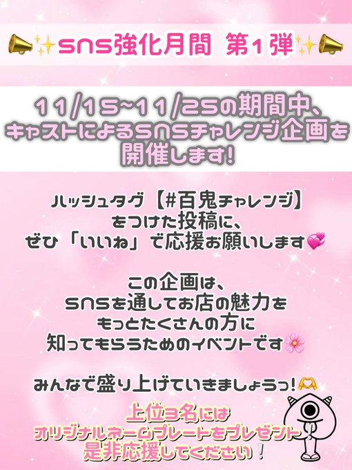 栄・大須・金山 コンセプトカフェ なでしこもちの🍡なでしこ@mochino_ndsc·11月13日これ、今まであげようか悩んでたやついっっぱいあげる予定なので全部いいねしてください(ˆ꜆ . ̫ . ) たのんだ🫵🏻引用株式会社 百鬼@Nakiri_chan_·11月10日✨SNS強化月間 第1弾✨ 11/15〜11/25のあいだ、キャストによる【#百鬼チャレンジ】がスタート🔥 気になる投稿を見つけたら「いいね」で応援してね💗 みんなの応援がキャストの力になります💪 上位3名にはオリジナルネームプレートの特典も🎁 この期間、SNSを通して一緒に盛り上がろう〜!!4264
