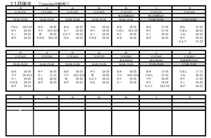 栄・大須・金山 カルティアχαρτια-カルティア-🃏❤️キャスト募集中@xaptia_concafe·🃏11月前半シフト🃏 月〜金 18:00〜25:00 土日 17:00〜25:00 毎週金曜土曜(他イベント日除く)飲み放題DAY🍻🫧 🔽今後のイベント予定 12/6 ひよりBDEV 🐣 12/13 ゲストさん予定✝️🖤 12/19.20.21.22 クリスマスEV🎄🌟25632