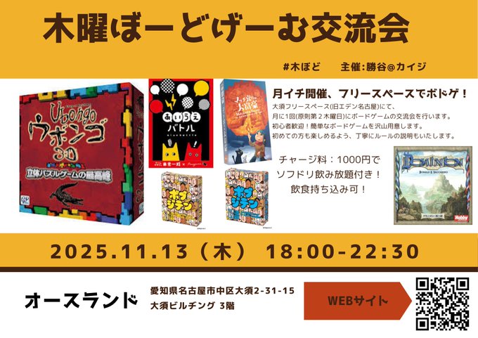 栄・大須・金山 オースランドオースランド@ボドゲカフェ&ゲームバー@osland758·5時間13日木曜日は定休日ですが、木ぼど開催のためオープンします! よろしくお願いします!引用勝谷@カイジ 英傑大戦 日ノ本の士@4183k_kaiji·11月6日来週は… #木ぼど !! オースランドにてボードゲーム会を開催します。 よろしくお願いします3213