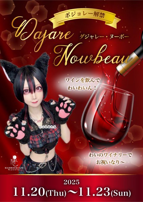 栄・大須・金山 メイドロックカフェ名古屋にゃんめたる🎸0124✦︎0125@MAIDROCKCAFEさんがリポストまりん🎙@MAIDROCKCAFE@marine_mrc_·18時間ニャンさんが滑ってるみたいだろこれ引用メイドロックカフェ名古屋【公式🎸】@mrc__ngy·11月8日⚡️📡緊急発信📡⚡️ 11/20~11/23 【ダジャレーヌーボー】 【~ワイのワインでお祝いなり〜~】 🍷🍷開催🍷🍷 このタイトルに特に意味は無いです!! 皆んなでボジョレー解禁をお祝いしましょう♪ 当日はワインとそれに合うフードをご用意してお待ちしております🍷🧀 ⚡️FEEL THE ROCK⚡️21231,423