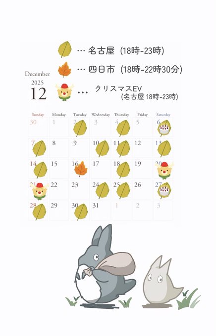 栄・大須・金山 おれのメイド。ひなの@hinano_oremei·2025年12月お給仕表です🍁 6(土)⋯あすみん生誕&卒業 20(土)、21(日)⋯クリスマスEV 27(土)⋯ことりちゃん生誕 中トトロと小トトロ描いた!かわいい 12月もよろしくお願いします371