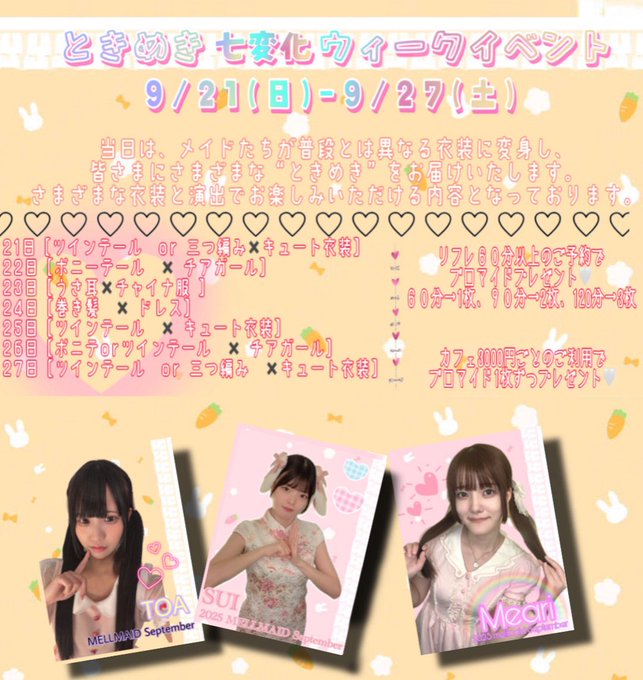 まなつ🍒めるめいどさんがリポストめるめいど【名古屋大須メイドカフェ/リフレクソロジー】@mellmaid·イベント情報🎶 ✨💖 ときめき七変化ウィーク 💖✨ 📅 9/21(日)〜9/27(土) 今日はどんな“ときめき”に出会えるかな?💕 メイドたちが日替わりで変身して、ドキドキとわくわくをお届けしちゃいます! 🎀 日替わりときめき衣装 🎀 🌟 21日 ツインテール or 三つ編み × キュート衣装 🌟 22日さらに表示28605