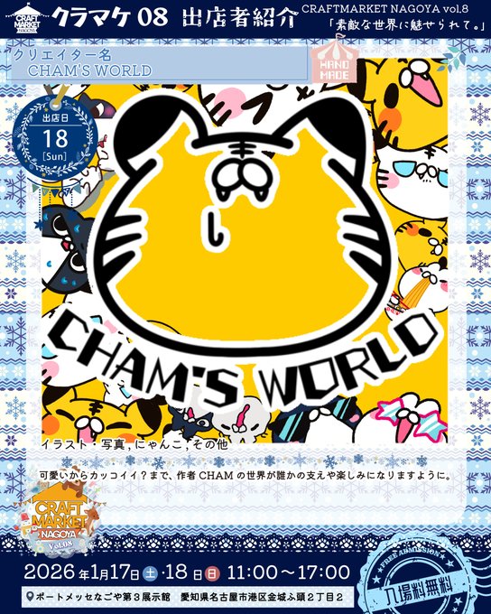 栄・大須・金山 おれのメイド。ちゃむ🐯🍜CHAM'S WORLDさんがリポストCRAFTMARKET@2026年1月17日,18日(土日)ポートメッセなごや第3展示館@CRAFTMARKET6·#クラマケ08出店者紹介📣 出店日 18日(日) [CHAM'S WORLD @cham_ch_i /イラスト・写真,にゃんこ,その他] 詳細はこちら: https://craft-market.jp/single-event-details/?stall_id=54212…39426