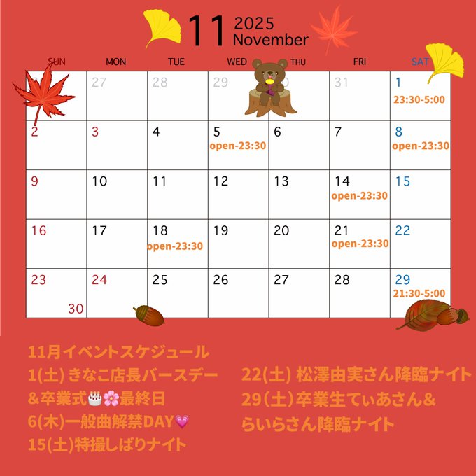 栄・大須・金山 アニソンバー綾波綾波園子@AyanamiSonoko·11月5日5日‼️本日も綾波出勤してます❤️🔥✨ 園子は21:00〜05:00でお待ちしてます👍 オープンからはえすぱさん💖🎶 ラストまではここあちゃんといます🌃💤 #アニソンバー綾波引用綾波園子@AyanamiSonoko·11月4日11月📝💭 04-🔥--21:00〜 05-💧--21:00〜 06-🪵--21:00〜 11-🔥--23:00〜☁️ 13-🪵--20:30〜☀️ 18-🔥--21:00〜 25-🔥--20:30〜☀️ 27-🪵--21:00〜110688