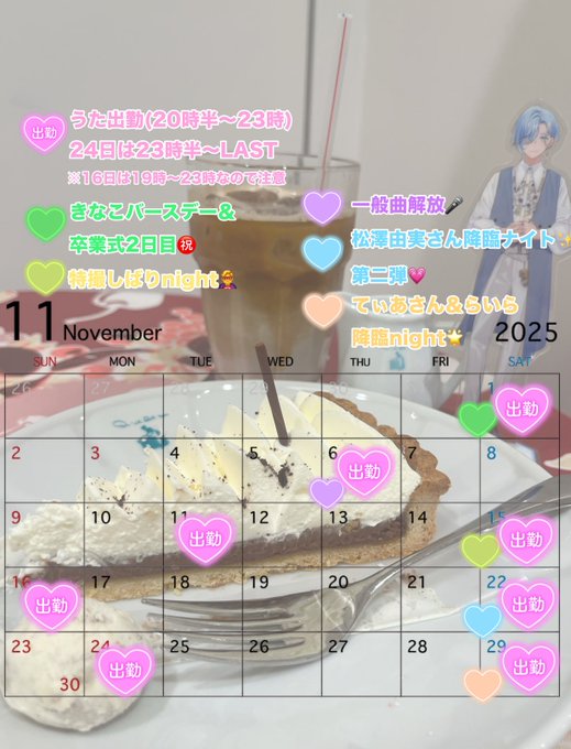 栄・大須・金山 アニソンバー綾波固定えすぱ🍓綾波@HCqp42·こんにちは、えすぱです✨ 11月の出勤簿ができました‼️ 出勤はそんなに多くないかもしれんけど、少しでも会いに来てくれたら嬉しいで〜す✨ 豪華なイベントも控えてて楽しみ楽しみ😊 #アニソンバー綾波7173