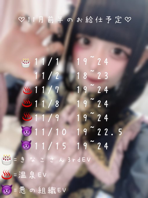 あめの@PARFUN@ameno_parfun·♡11月前半の予定♡ 遅くなりましたが、たくさんのイベント満載なのでたくさんいます😼😼👍🏻愛車もたくさんカスタム予定なのでみんなに見せれたらと(^-^)V 11/1 きなこさん3rd 11/3~11/9 温泉EV 11/10~11/15 悪の組織EV #名古屋コンカフェ #大須コンカフェ #コンカフェ #コンカフェ営業2134