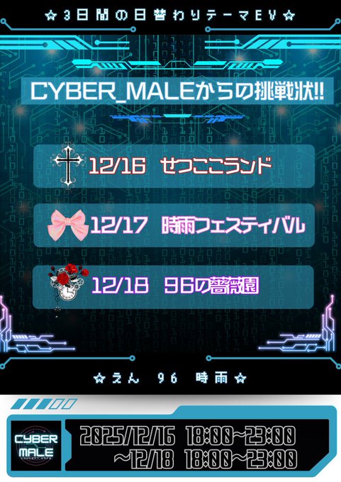 れん🤍Cyber_Male@C_Male_ren·29分明日からこちらです えんさん時雨さん96さんのイベント!! 全部楽しそうすぎて行く人羨ましい🥹🥹🥹 僕はいません!!!!引用🌐Cyber_Male🔊名古屋大須メンズコンカフェ@Cyber_Male_·14時間【⚠緊急 ゲリライベント📷】 ☆日替わりテーマEV☆ 期間:12/16~12/18 イベント、特典詳細は画像を参照ください。 #メンコン #大須 #コンカフェ #名古屋 #メンズコンカフェ #サイバーメールで接続完了2