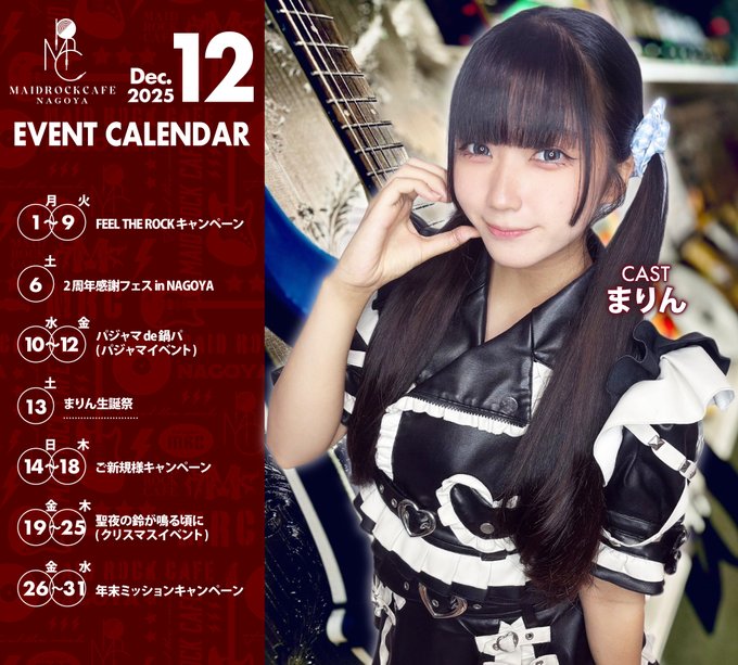 栄・大須・金山 メイドロックカフェ名古屋固定おてて🎸🐇@MAIDROCKCAFE@otete_mrc·12月後半おていん予定🫴🐇 16日 (火) 17- 🔰 18日 (木) 17- 🔰 | 20日 (土) 17- 🎄クリスマス 23日 (火) 17- 🎄(19日〜25日) | 30日 (火) 17- 🍊年末キャンペーン 31日 (水) 15- 🍊(26日〜) ほぼ毎日いる!!! 29日でおててMRC2️⃣周年です💖💖💖 #おていん18217