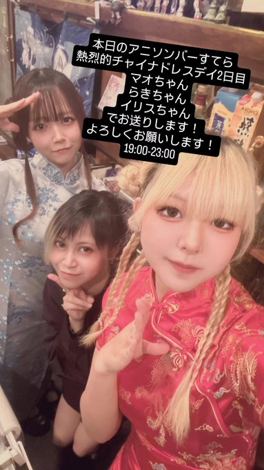 マオさんがリポストアニソンバーすてら@anisonbarstella·#アニソンバーすてら 熱烈的チャイナドレスデイ2日目! 本日はマオちゃん、らきちゃんイリスちゃんでお送りします!よろしくお願いします! 遠隔http://stellaenkaku.base.shop #コンカフェ #アニソンバー #三宮コンカフェ #アニメ好きな人と繋がりたい #コンカフェ好きと繋がりたい #コンカフェ営業ください26142