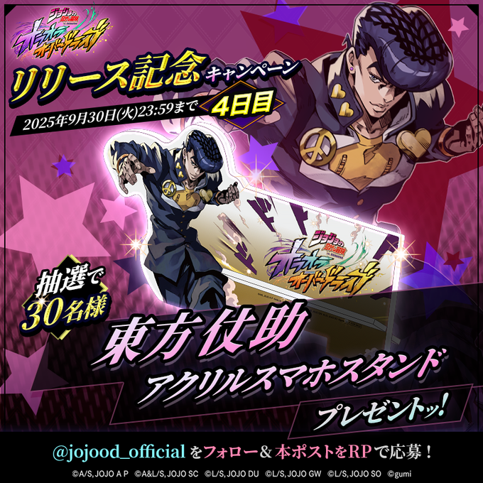 らきさんがリポストジョジョの奇妙な冒険 オラオラオーバードライブ【公式】@jojood_official·/ 『#ジョジョの奇妙な冒険 オラオラオーバードライブ』 リリース記念キャンペーン4日目🎁 \ 抽選で30名様に アクリルスマホスタンドをプレゼントッ! ▼参加方法 ①@jojood_officialをフォロー ②本投稿をリポスト ✅応募期限:9/30(火)23:59 #オラドラ #ジョジョ638,6994,51524万