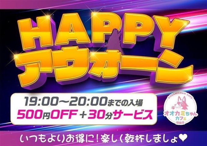 オオカミちゃんカフェ姫路店@ookami_himeji4·今日もやります、『Happy アウォーン🐺』!!!! 最初のセット料金500円OFF & +30分! 今日は13人のオオカミちゃんが出勤中🐺💜 #オオカミちゃんカフェ #オオカミちゃんカフェ姫路 #姫路ガールズバー #姫路 #姫路コンカフェ55