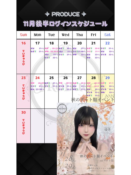 京都 PRODUCE固定PRODUCE@PRODUCE_gion·PRODUCEイベントのお知らせ📢 【秋のデート服イベント🍂】 11/28(金)29(土) 衣装:デート服(秋ver) 詳細は下記画像をご参照下さいませ♪ #京都コンカフェ #祇園コンカフェ129