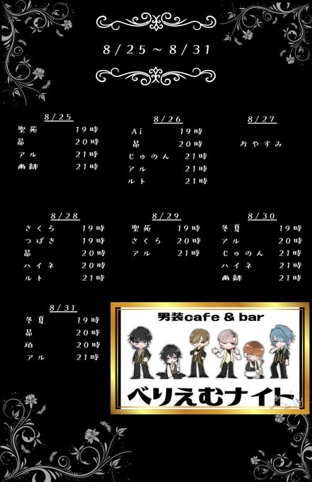 べりえむナイト❖男装コンカフェ@Veri_m_v·8/25〜8/31の出勤表 OPEN 19:00〜 ■8/27はお休みです。 8月最終週も皆様のご入国お待ちしてます。 #男装カフェ #神戸三宮 #べりえむナイト #conceptcafe1656