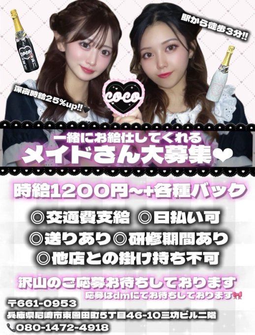 COCO@COCO_concafe·メイドさん大募集です♡ 初めての方もメイドさんになれます◎ 兵庫県尼崎市の阪急園田駅です❕ たくさんのご応募お待ちしております🎀 #コンカフェ #コンカフェ兵庫 #コンカフェ大阪 #コンカフェバイト #コンカフェキャスト #コンカフェ求人 #コンカフェ好きと繋がりたい1265