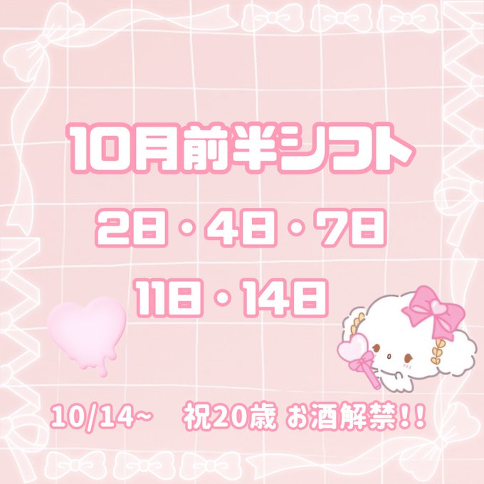 固定らき@Lucky__131017·10月前半シフトです! 10/14〜は㊗️お酒解禁㊗️なので、ぜひお酒飲ませてください🥹 10/24,25は私の人生初めてのバースデーイベントもやるのでぜひ遊びに来てください(ˆ꜆ . ̫ . ).ᐟ.ᐟ3104