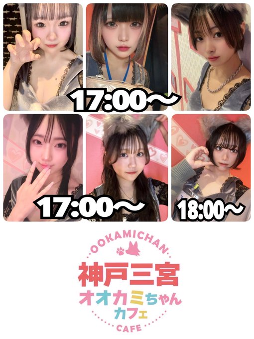 オオカミちゃんカフェ神戸三宮店@ookamichancafe·10月1日(水) 本日出勤のオオカミちゃん🐺 17:00~ 💛ありあ💛もも 💛まき💛みゆ 17:30~ 💛ここみ 18:00~ 💛ひかり💛きらら 18:30~ 💛ゆうあ💛かのん 19:00~ 💛じう💛めあ 💛べる💛ねる 21:00~ 💛ひな #オオカミちゃんカフェ #神戸 #三宮 #三ノ宮 #関西コンカフェ #コンカフェ #ガールズバー7