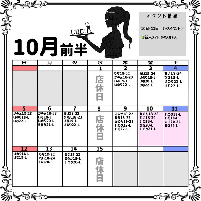固定COCO@COCO_concafe·10月前半のシフトです❕ 今月のイベントは10日、11日でナースイベントを開催します💉 ナースいいですね、好きです私も。☺️☺️☺️ 季節の変わり目で風邪が流行っています!ナースが治します❣️ 新人ちゃんも今月からいてくれてるので見に来てください🙇♀️ 10月前半もよろしくお願いします🫶2242