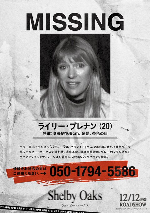 兵庫・神戸・三宮 アニソンバーすてららき@Lucky__131017·2時間なにこれおもしろそう引用映画『シェルビー・オークス』公式@shelbyoaks_jp·11月26日ライリー・ブレナンを捜しています 情報をお持ちの方は コチラ までご連絡ください 📞050-1794-5586 また本件の情報拡散にも ご協力ください ①当アカウントをフォロー ②この投稿をリポスト 12/7 締切 映画『シェルビー・オークス』ムビチケを 抽選で5名様にプレゼント 📽️12.12公開126