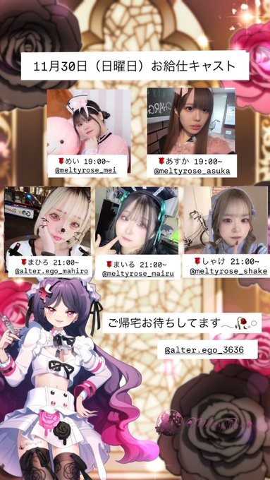 京都コンセプトバーMeltyRose🥀💉@MeltyRose___·11月30日(日曜日)のお給仕です🌹 🌹めい 19:00~ 🌹あすか 19:00~ 🌹まいる 21:00~ 🌹しゃけ 21:00~ 🌹まひろ 21:00~ ご帰宅お待ちしてます𓂃🥀𓈒𓏸 @AlterEgo_3636 もお給仕いたします17