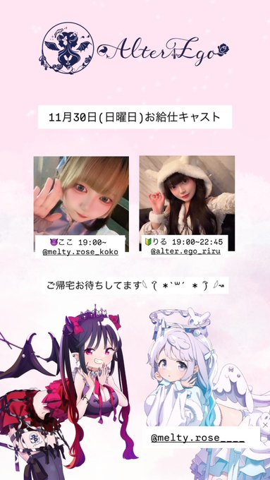 京都コンセプトカフェ&バーAlterEgo👼🏻‎@AlterEgo_3636·11月30日(日曜日)のお給仕です😈👼 😈ここ 19:00~ 🔰りる 19:00~22:45 ご帰宅お待ちしてます𓆩 (⃔ *`꒳´ * )⃕ 𓆪↝ @MeltyRose___ もお給仕いたします1