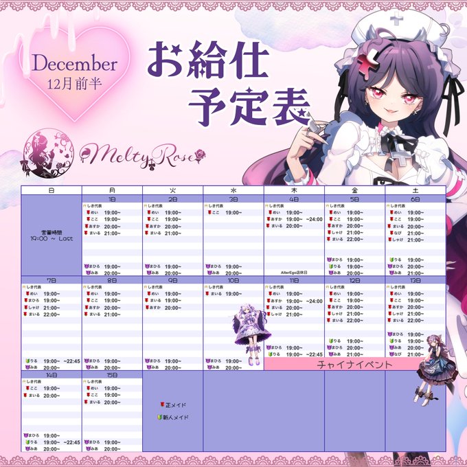 固定京都コンセプトバーMeltyRose🥀💉@MeltyRose___·12月前半お給仕予定表です💉🥀 ご主人様、お嬢様のご帰宅お待ちしてます #京都コンカフェ #木屋町コンカフェ #コンカフェ営業ください1284